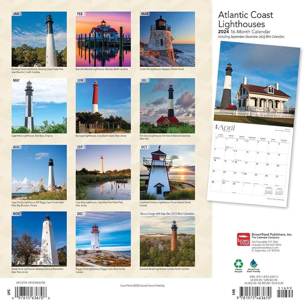 Atlantic Coast Lighthouses | 2024 12 x 24 Inch Monthly Square Wall